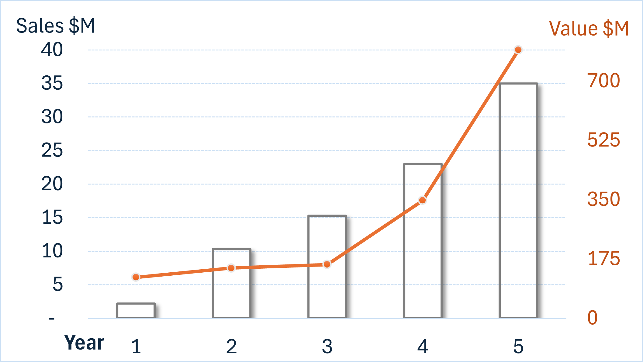 Grow at 50%. Exit 3-4 yrs at 10–22x sales